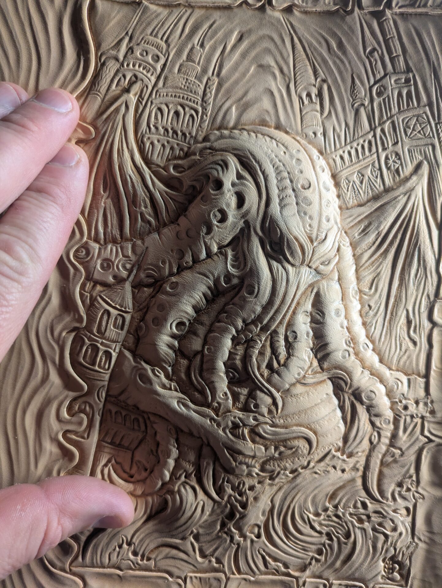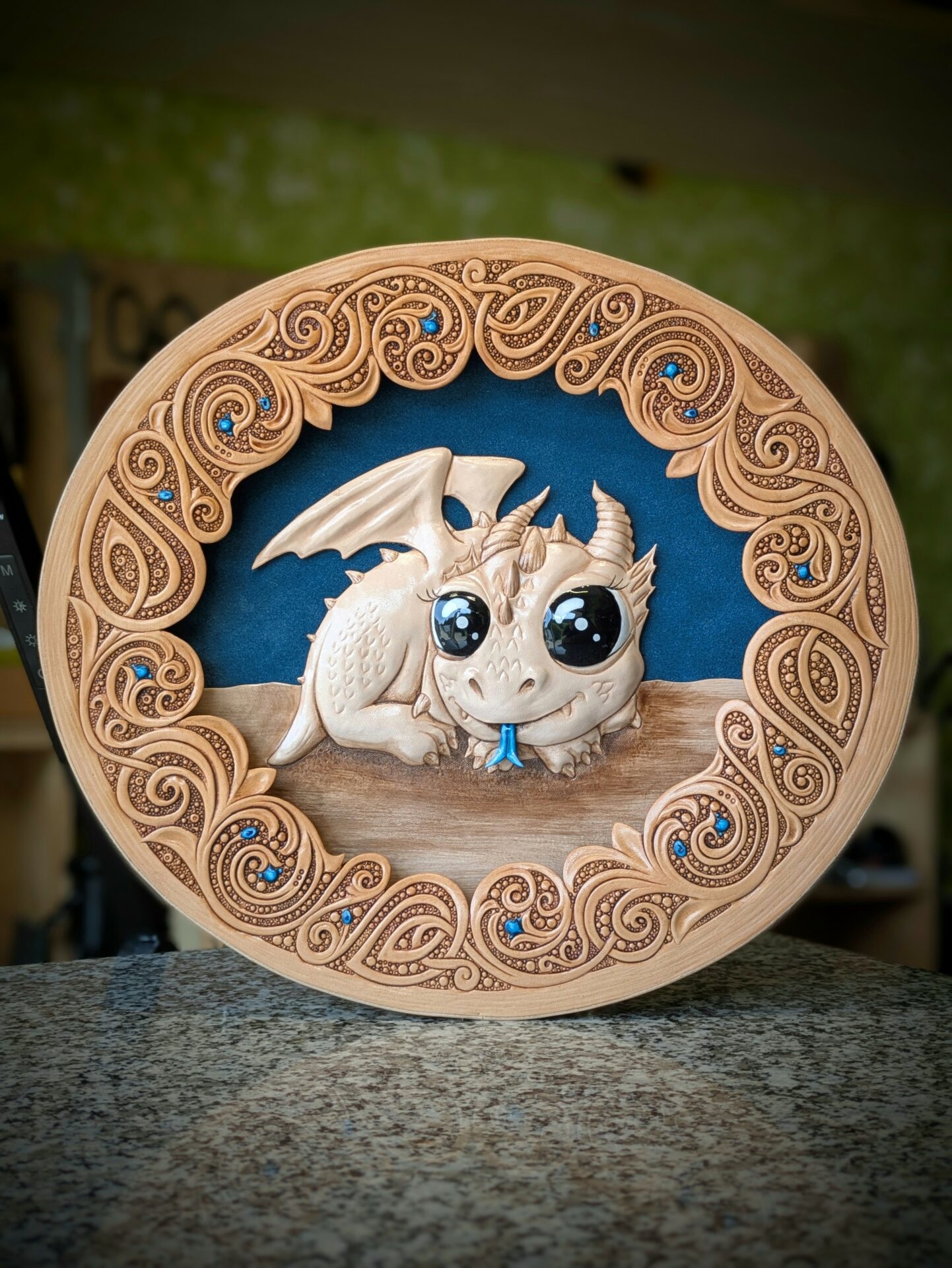 Un stage de deux jours pour fabriquer un petit tableau représentant un bébé dragon embossé en 3D avec un cadre en cuir décoré d’un entrelacs celtique. Quelques touches de peintures, effets d’ombrages et vernis sélectif.